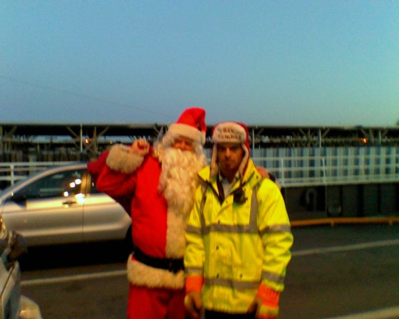 What a surprise! Santa Claus and one of his trusty elves were on hand to help park cars and give out toys to children on the Guemes Ferry, December 24th, 2009.