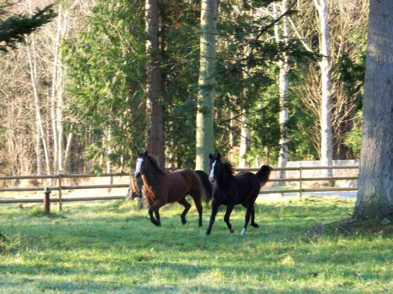 Tess (brown Quarterhorse) and her son, Alegre (black Azteca), enjoy a romp in the mid-February sunshine. Alegre turns one year old on March 13, 2010 (picture & caption, Tim Wittman)