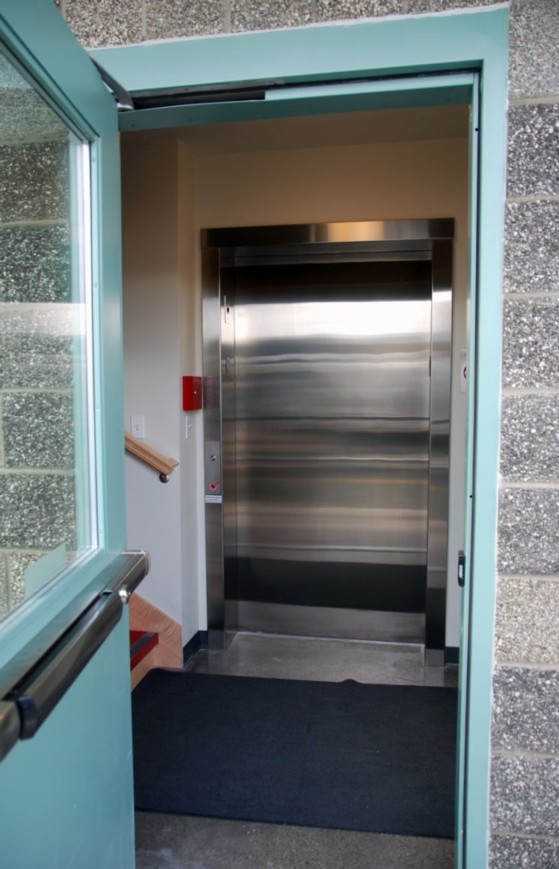 Our tour of the new Guemes Ferry terminal begins at the crew entrance. Elevator door ahead. Staircase to the left leads to offices and crew break and locker rooms. Purser's office is to the right.